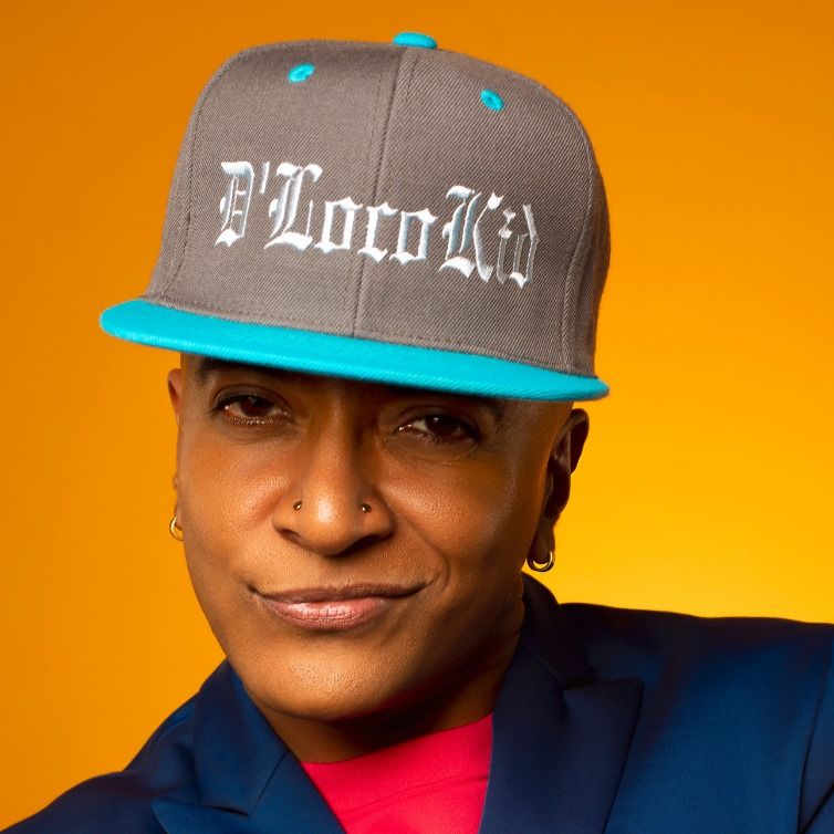 D'Lo smirks from under a basketball cap that reads "D'Loco Ktd". D'Lo has brown skin,