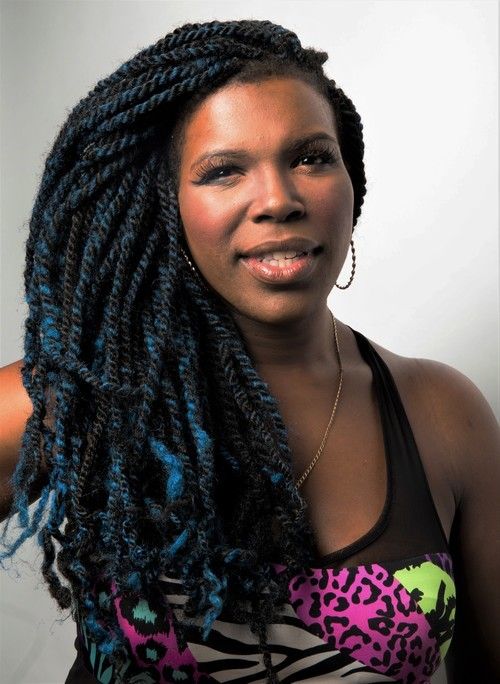 Mizz June is a Black trans woman with dark brown skin posed in front of a white background.  She has long black twists with blue accents and is wearing hoop earrings. She is wearing an assorted patterned shirt including a cheetah, zebra, leopard print in assorted colors.