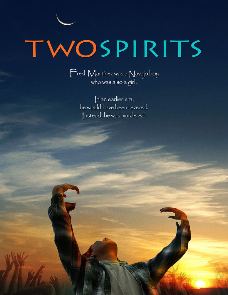 The image depicts a person wearing a plaid shirt who is throwing their head and hands up dramatically in front of a colorful sunset sky. The setting sun is visible in the lower right corner of the image, casting the bottom of the frame in a hazy orange glow. A thin sliver of crescent moon is visible in the upper left corner of the image, surrounded by a navy blue night sky. In between the two, in the middle of the poster, is a line of clouds. At the bottom of the poster, behind the person who is throwing their hands up, are several more hands, which are slightly transparent and grasping up at the sky. Just below the moon is the film's title, "Two Spirits," with the word "Two" in orange and the word "Spirits" in light blue. Beneath the title is the following text introducing the topic of the film: "Fred Martinez was a Navajo boy who was also a girl. In an earlier era, he would have been revered. Instead, he was murdered."