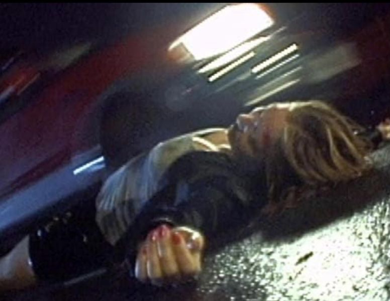 as if it rained. The person is lying sprawled out with blonde hair, a gray t-shirt