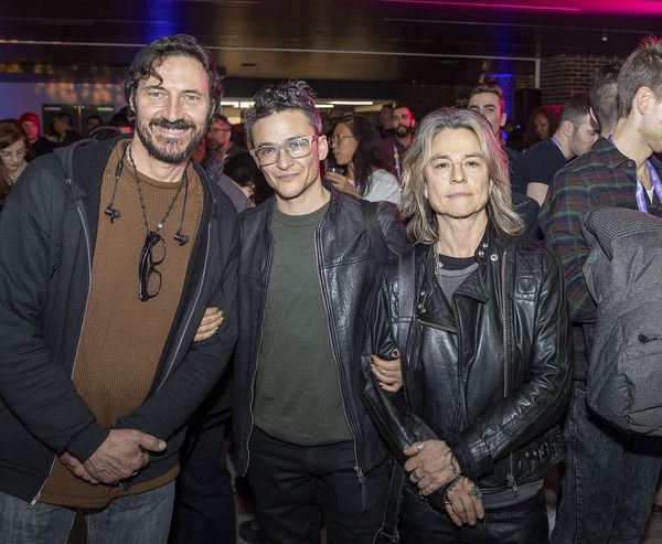 with wavy blonde shoulder-length hair, wearing a leather jacket. The other person