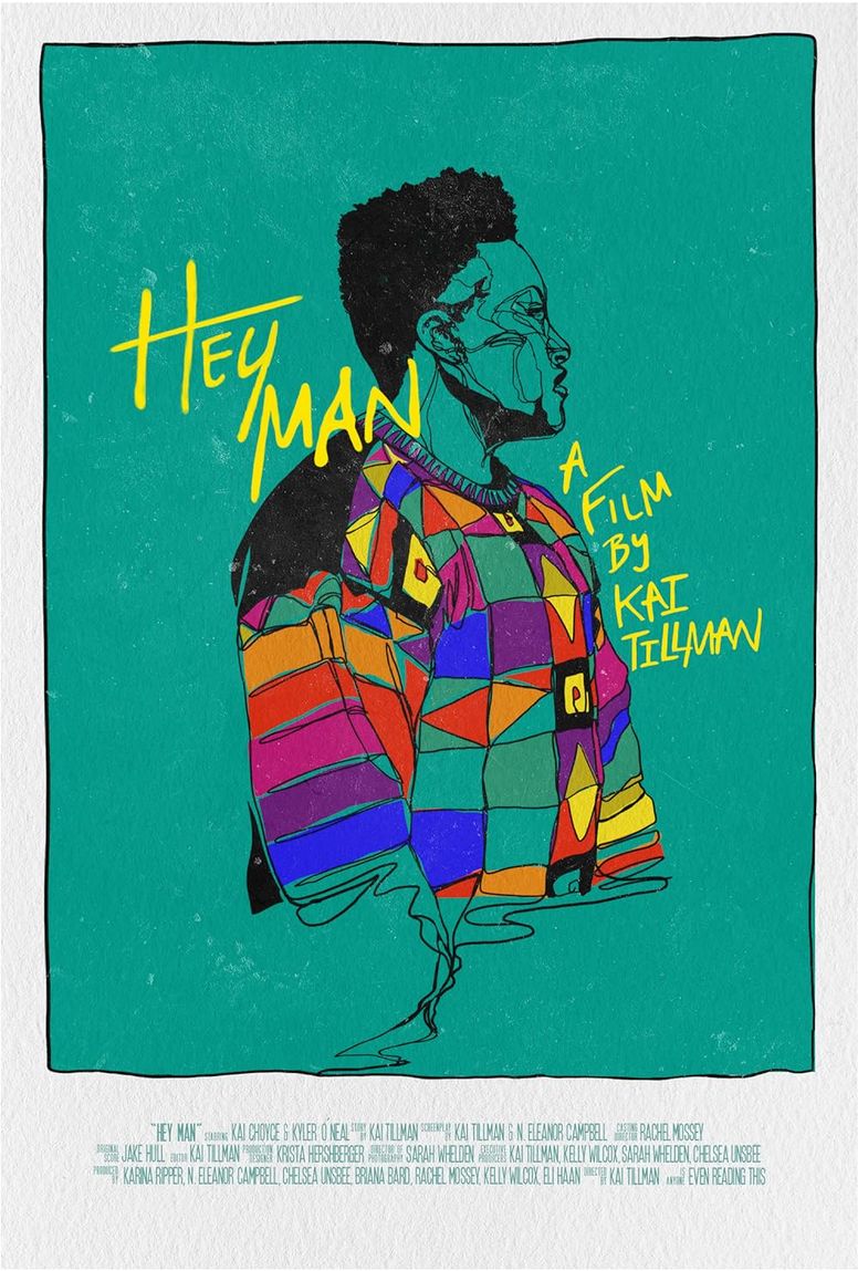 sweatshirt with very bright colors. The writting on the poster says "Hey Man A Film