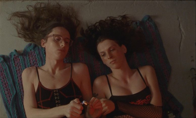 and fishnet-arm sleeves. The person on the left is lighting an object with a lighter