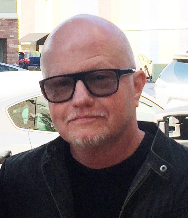 Grainy close-up selfie of Mickey R. Mahoney in a parking lot on a sunny day. Mickey
